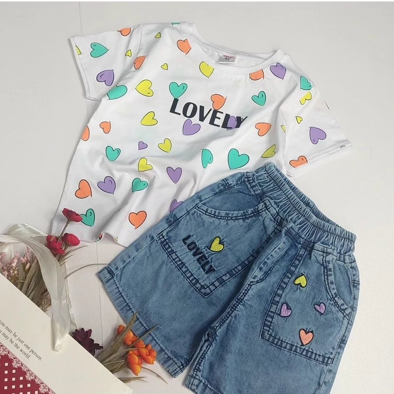 ناموجودست دخترونه تیشرت و شلوارک طرح قلب جنس تیشرت نخ پنبه جنس شلوارک جین سایز 35و40